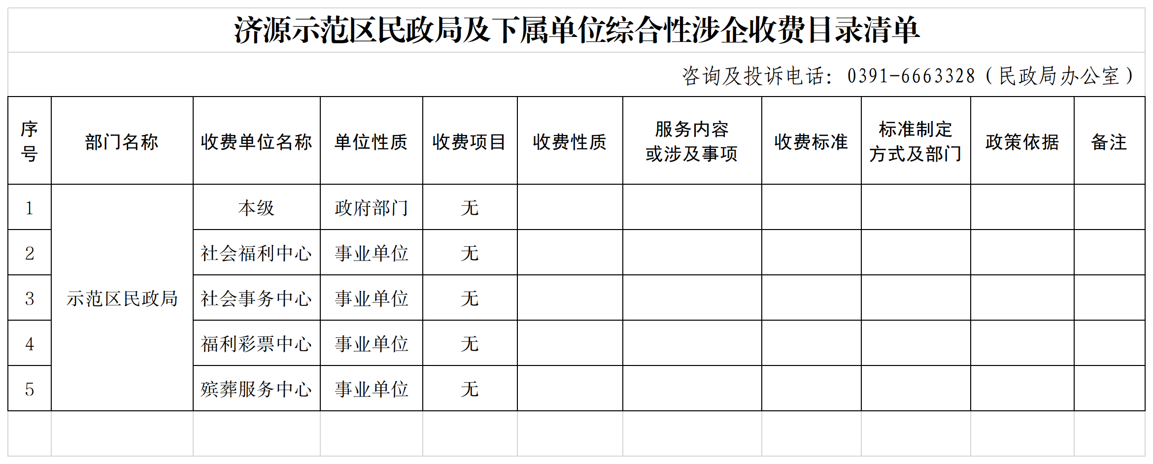 济源示范区民政局及下属单位综合性涉企收费目录清单