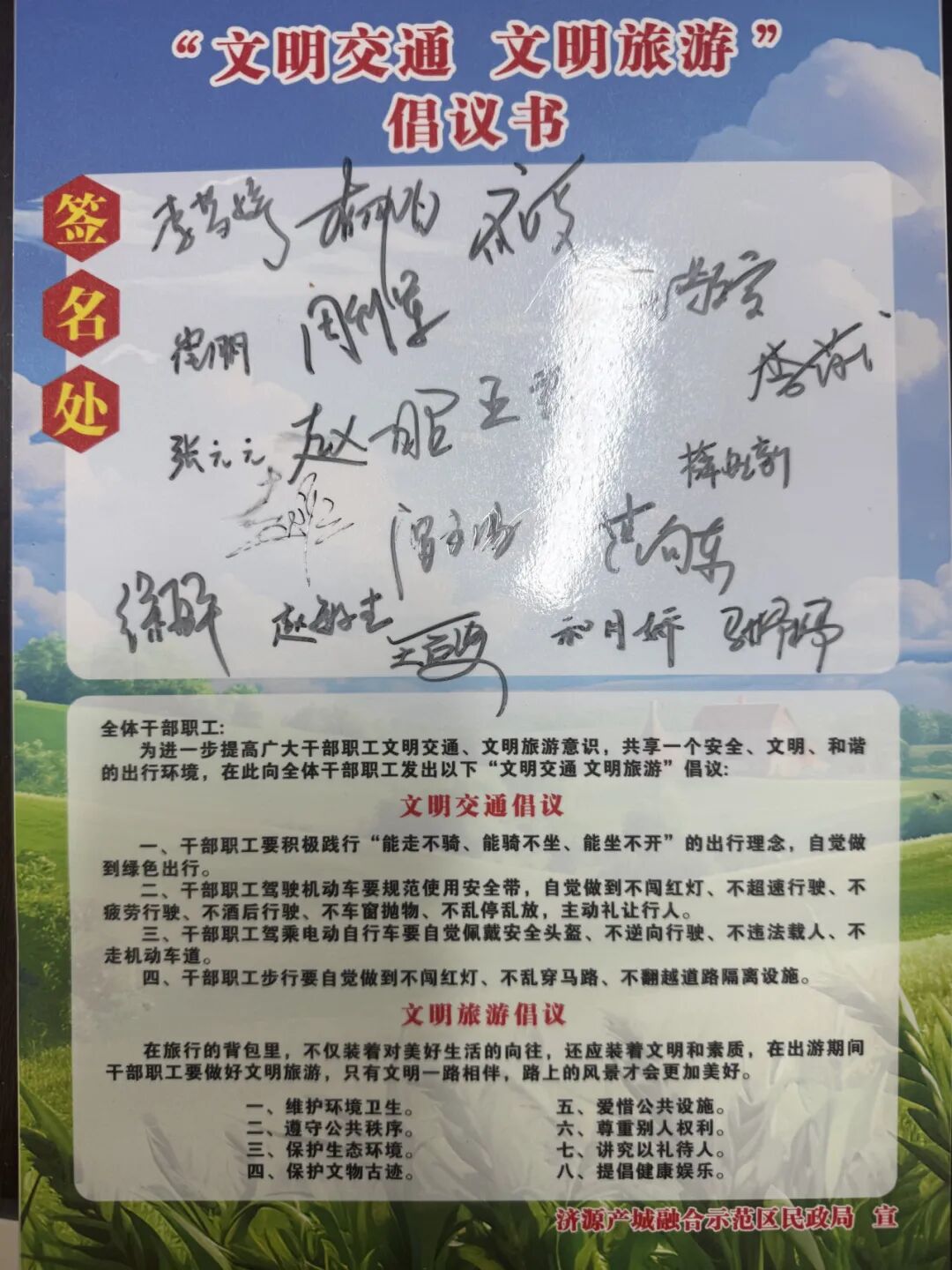集中学习《“文明交通 文明旅游”倡议书》,并在倡议书上签下名字。