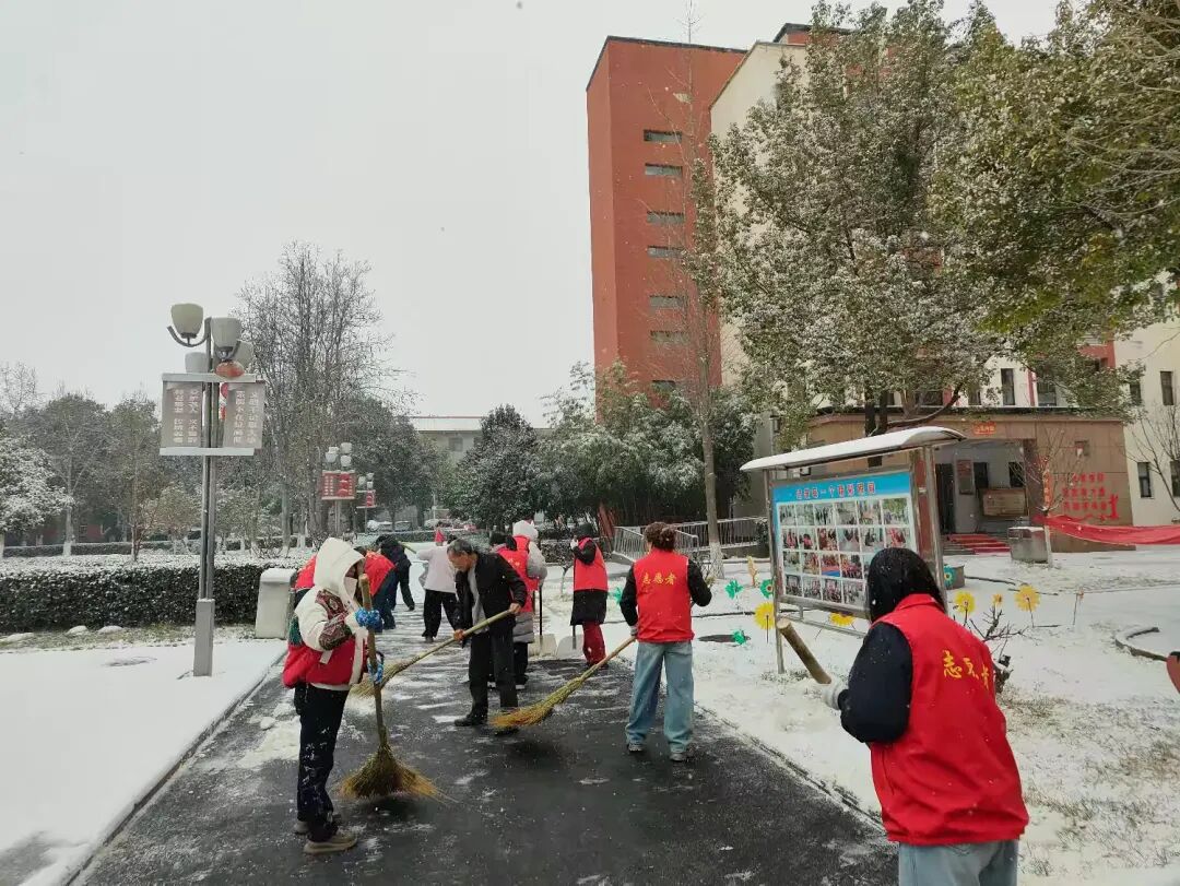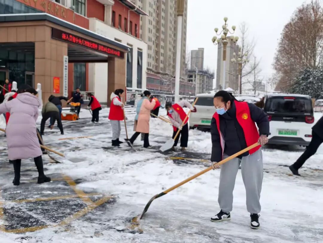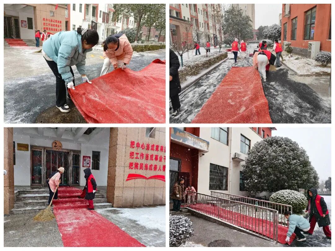 干部职工们身着红色志愿者马甲,大家手持铁锹、扫帚对主干道、活动广场进行清扫,并铺设防滑地毯,确保院民出行无忧。红色身影在白雪中形成了一道温暖的风景线。